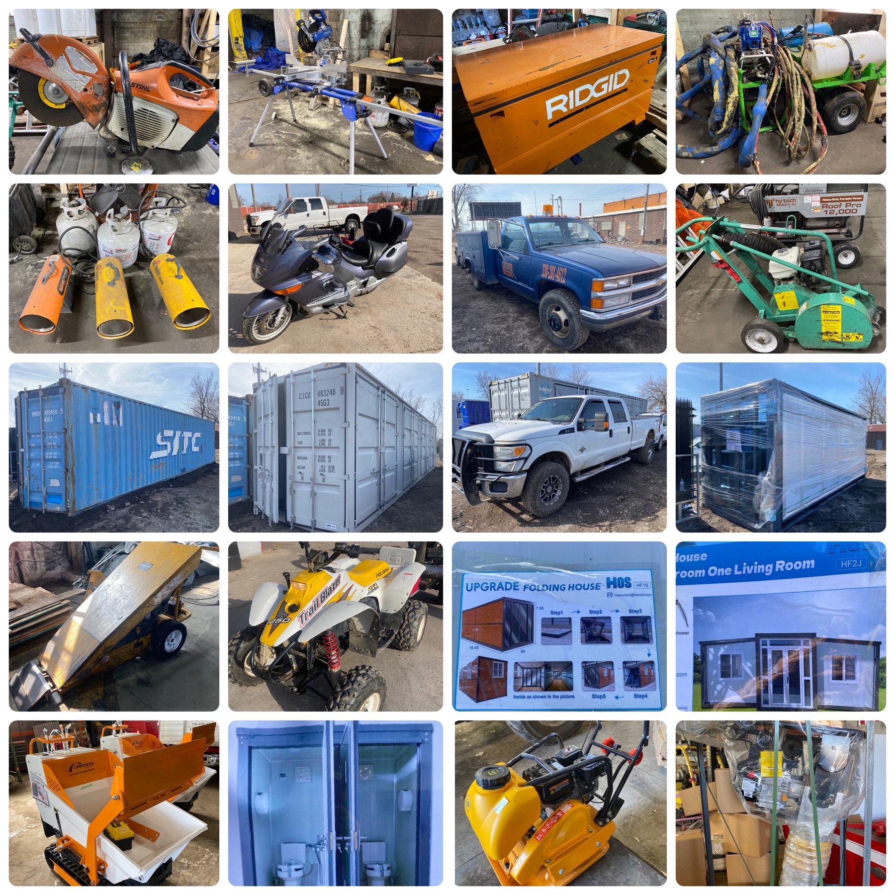 LANDSCAPE and INDUSTRIAL EQUIPMENT: , Arctic Chill Chilled Water Systems Co Chiller Unit , Approx 5ft Tall Man Cave 110v Beer Cooler , Buddy Red Indoor Safe Propane Heater , Bartell Concrete Equipment Co BG 5000w Generator , Onan Natural Gas Whole House Generator , Ariens Snow-thrower & Gas Powered Air Compressor , Portable Air Compressor , 32 Ton Bottle Jack , Pedestal Transmission Jack , New Chery Cast Iron Anvil , 3 pt 6ft Drag Blade , 5ft 3pt PTO Brush Hog , 5ft 3pt/PTO Brush Hog , Agri Fab 42" Sweeper , AgriFab Lawn Sweeper , Ford 231 Diesel Tractor w/ 90in Woods Finish Mower , Giant Vac Co Leaf Vac System , Simplicity Riding Lawn Tractor w/ Plow , Trac Vac Leaf Collection System , New Gold Mountain 20ft x 20ft Container to Container Shelter , New Gold Mountain 20ft x 40ft Container to Container Shelter , New Gold Mountain 20ft x 40ft x 12ft Storage Shelter , New LandHero Co Self Loading Mini Crawler/Dumper Model LDH-MCD500 , Steel Fuel Tank w/ Fill Rite 110v Pump , Galvanized Steel Fence , Sliding Gate Opener , Outlaw Grill/Smoker , Modine Warehouse Gas Heater , New Chery Steel Dump Hopper , NEW 2" x 50' discharge water hose , New Blue Viper 420cc Hot Water Power Washer , Assorted steel tread plate , 3M Wall Roller-Applicator , New Bastone Co Dual Mobile Toilet W2.15xL1.3xH2.26 , New Bastone Co Single Mobile Toilet Unit , New HOS HF-15 Foldable House Unit , New HOS HF2J Expandable 2 Bedroom/1 Bathroom House , New 40ft (4 side door) Steel Shipping/Storage Container , NEW Approx. Steel Shipping Container/Storage Unit/ Office , New Chery 8ft Steel Shipping Container/Office , New Chery 9ft Steel Shipping Container/ Office/ Storage Unit , New CIMC Special Logistics Equipment Co 40 ft (4 side door) Steel Shipping Container/Storage Unit , New NYIU 40ft (2 Side Door) Steel Shipping/Storage Container , Used 2011 Jiashan Xinhuachang 40ft Steel Shipping Container , 2009 Ford F-250 4x4 Plow Truck , 2 Dollys & CH Portable Air Tank , John Bean Co Tire Changer Model 8950 , Marion Co 18ft Enclosed Truck Box , (2) Working Pallet Jacks , Working Standard Pallet Jack , Paladin Gas Water Pump Model PLD-TWP80 , New Solar Power Auto Darkening Welding Helmet , Rolling Steel Table , Welding Table , John Bean Co Wheel Balancer Model VP System II , (2) Cub Cadet Hydrostatic Garden Tractors , (2) Gas Powered Snow Blowers , Bolens Riding Lawn Mower , Dewalt Blower w/ Charger , Greenworks 21" Electric Mower , Metal Wheelbarrow , New EGN Co Remote Control Crawler Lawn Mower Model EG-750 , Yard Equipment Lot , (10) Steel Frame Cart , (10) Steel Frame Carts , (2) Large All Weather Security Lights , (20) Cases of Thermo Scientific DeepWell Plates , (4) Steel Stackable Cage w/ Tote , (5) Pallets of Black 5-Gallon Steel Pails , (5) Solid Steel Carts – No Doors , (5) Steel Carts - Slots w/ side door , (6) 330 Gallon Insulated IBC Totes – Non Food Grade , (8) Rolls of TPO White/Yellow Walkway 34in x 50ft , Annealed Glass - (1) Crate of 11 pieces , Annealed Glass - (1) Crate of 15 pieces